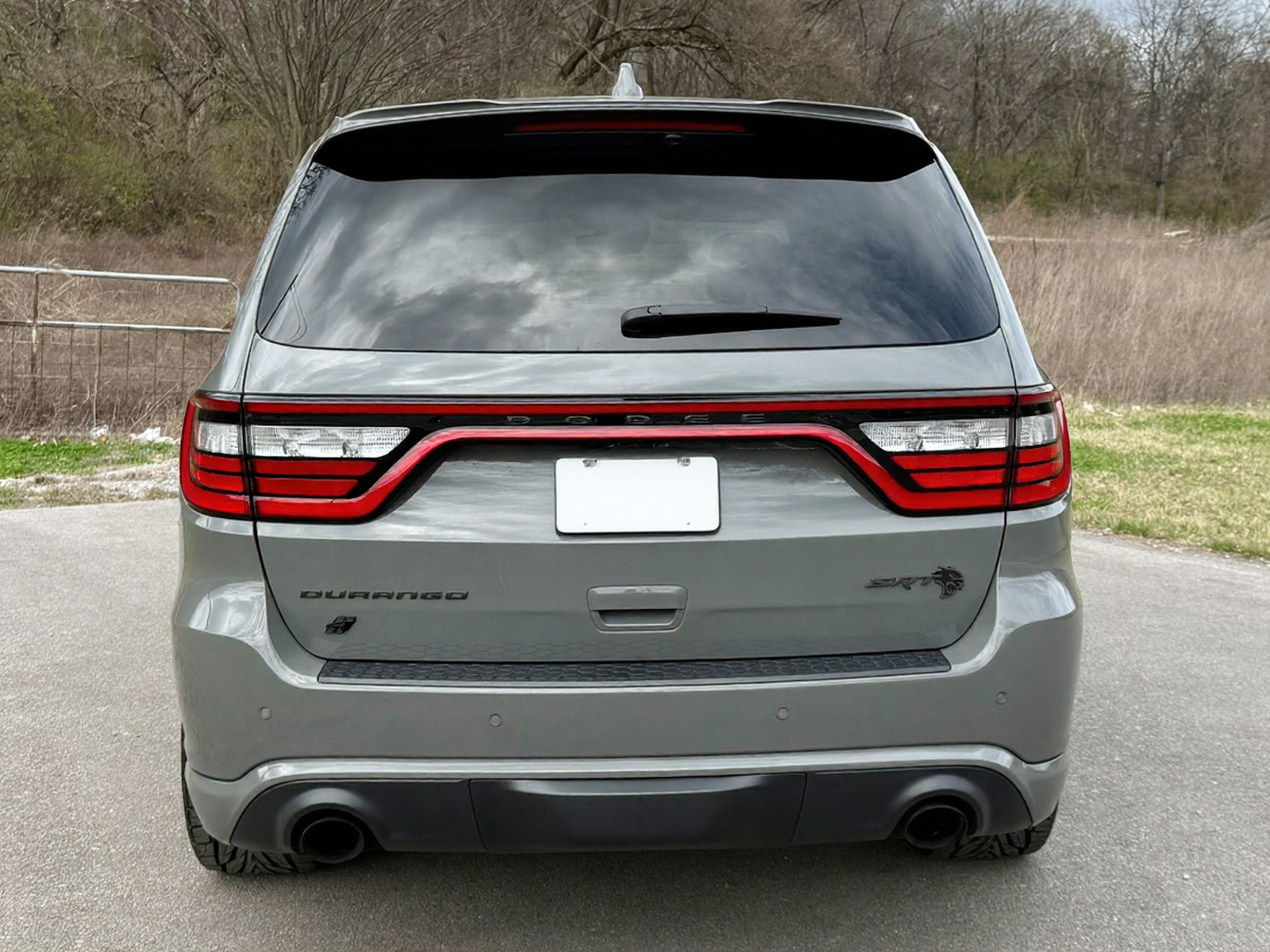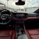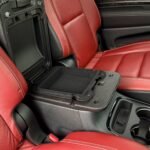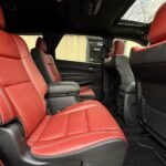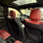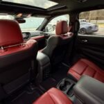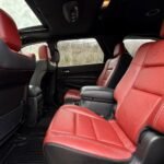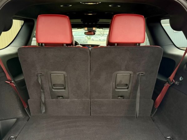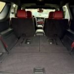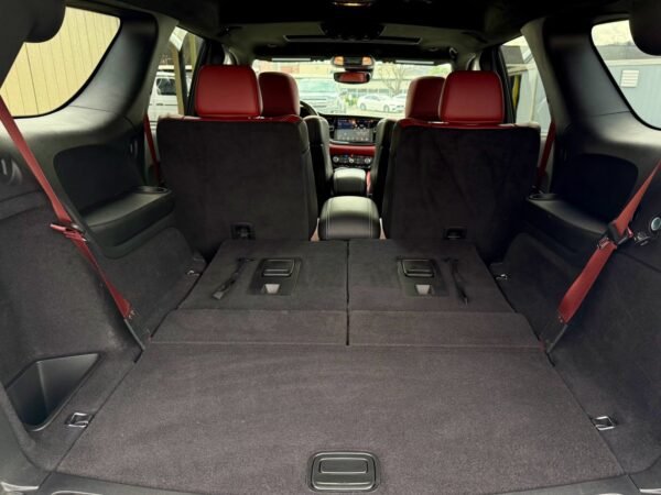 The exterior is finished in Destroyer Grey Clear Coat and features the Black Package, which adds 20-inch “Lights-Out” aluminum wheels, gloss-black mirror caps, gray metallic badging, and eclipse-black exhaust tips. Additional exterior elements include a functional hood scoop, LED lighting, a power-operated liftgate, and rain-sensing wipers.