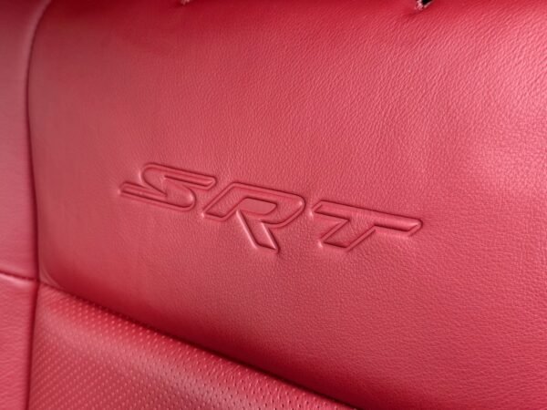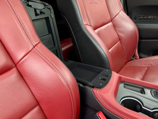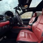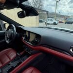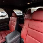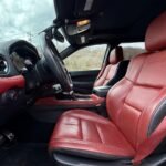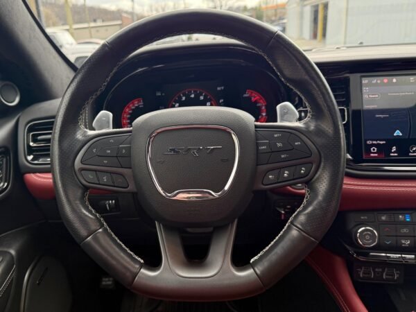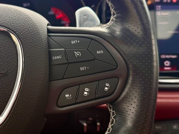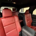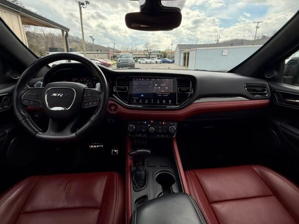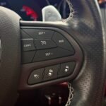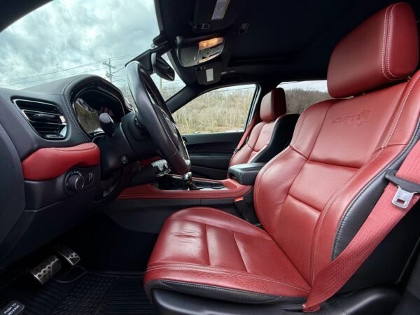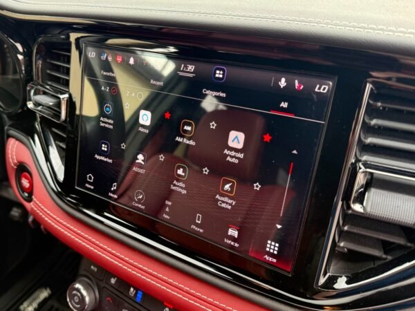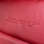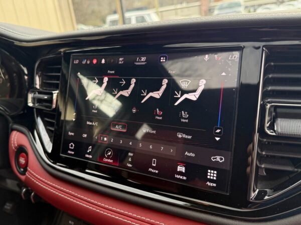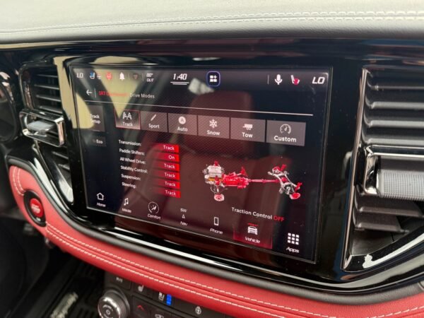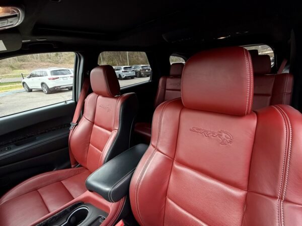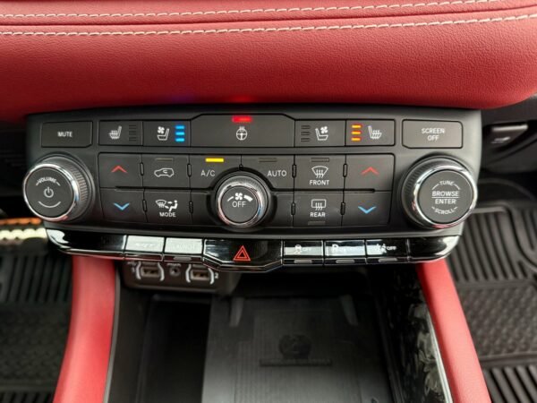 Inside, the cabin is configured with high-performance Laguna leather sport bucket seats in a Black and Demonic Red color scheme. The Premium Interior Group elevates the cabin with a suede headliner, a premium-wrapped instrument panel, and forged carbon fiber accents. Rear-seat passengers benefit from a second-row console with armrest storage and illuminated cupholders. Technology and convenience features include the Uconnect infotainment system with a 10.1-inch touchscreen, wireless Apple CarPlay and Android Auto, and an 825-watt Harman Kardon audio system with 19 speakers and a subwoofer.