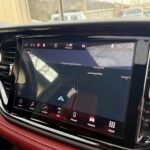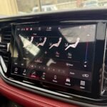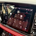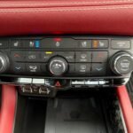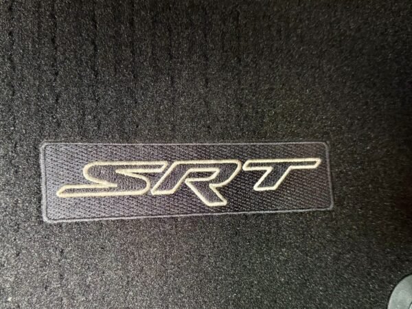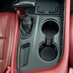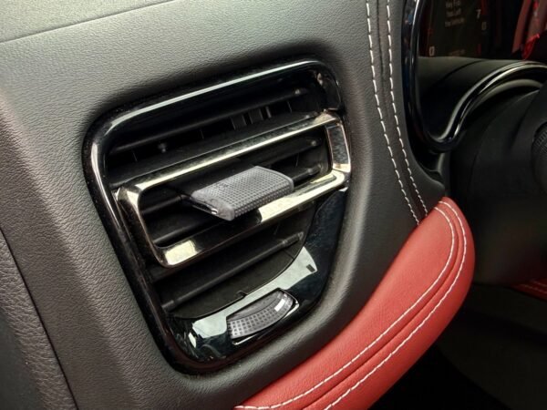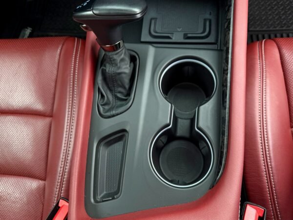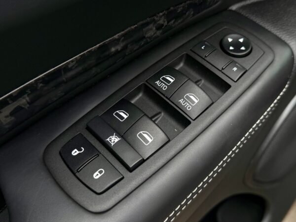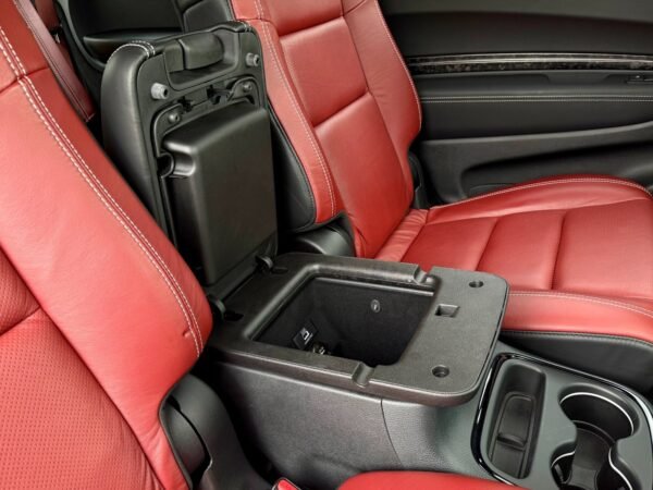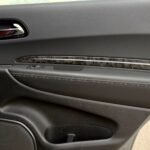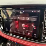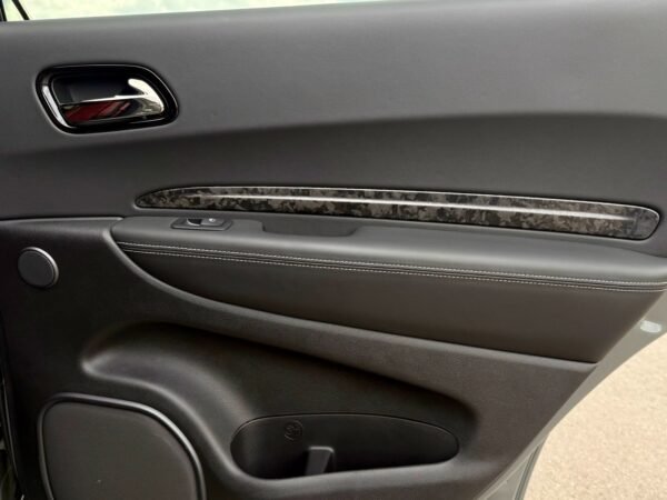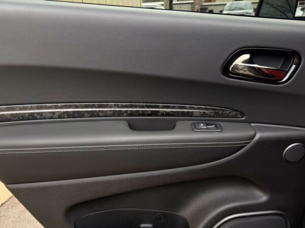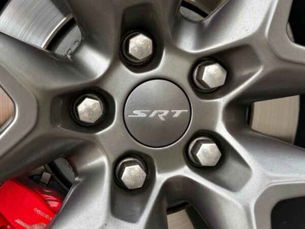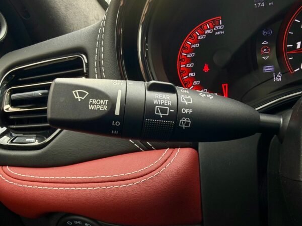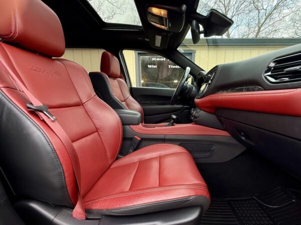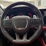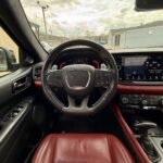 Inside, the cabin is configured with high-performance Laguna leather sport bucket seats in a Black and Demonic Red color scheme. The Premium Interior Group elevates the cabin with a suede headliner, a premium-wrapped instrument panel, and forged carbon fiber accents. Rear-seat passengers benefit from a second-row console with armrest storage and illuminated cupholders. Technology and convenience features include the Uconnect infotainment system with a 10.1-inch touchscreen, wireless Apple CarPlay and Android Auto, and an 825-watt Harman Kardon audio system with 19 speakers and a subwoofer.