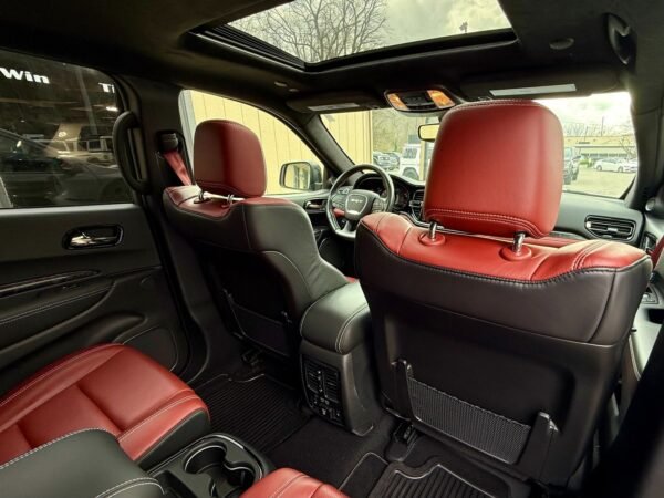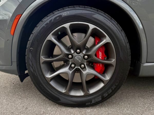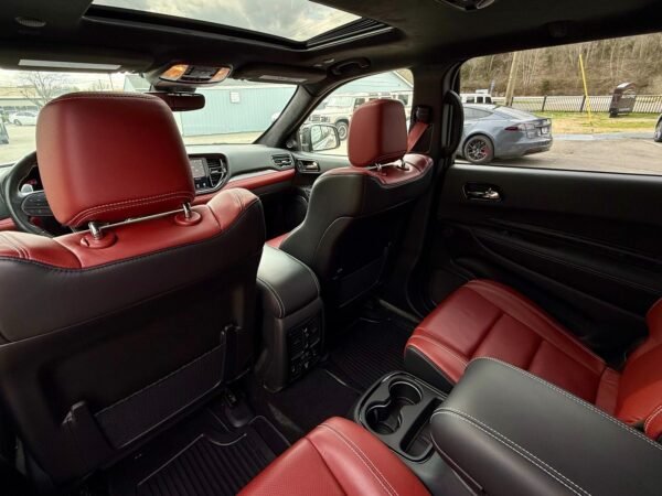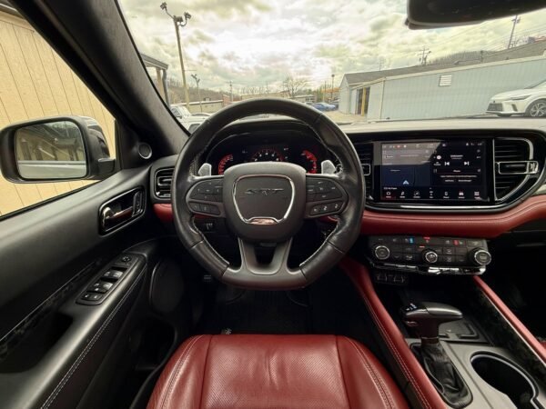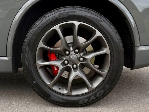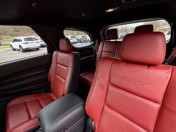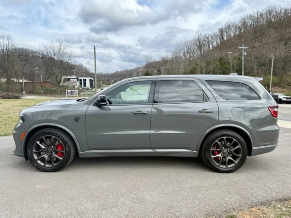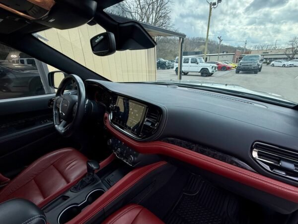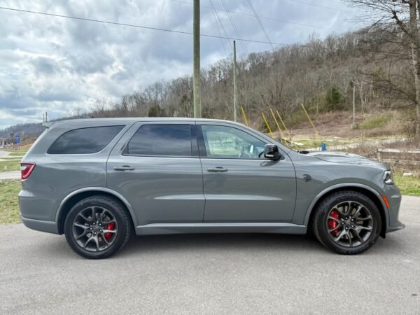 This 2021 Dodge Durango SRT Hellcat is finished in Destroyer Grey Clear Coat over a Black and Demonic Red Laguna leather interior. It is offered as a repossessed asset and is powered by a supercharged 6.2-liter HEMI V8 engine paired with an eight-speed automatic transmission and an all-wheel-drive system.